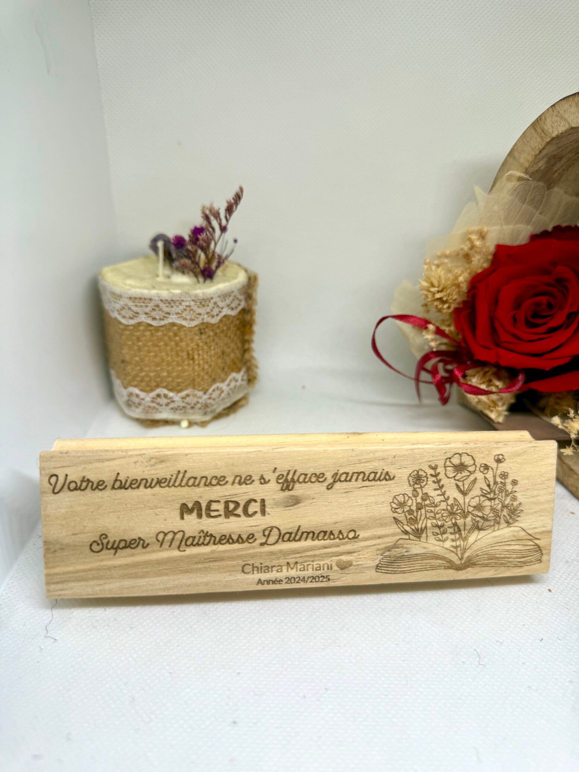Ajoutez une touche personnelle et élégante à la salle de classe avec nos effaceurs de tableaux en bois gravés. Fabriqués à partir de bois de haute qualité et munis d'une feutrine durable, ces effaceurs sont l'accessoire indispensable pour tout enseignant. Personnalisables avec un message, un nom, ou une citation inspirante, ils sont à la fois pratiques et esthétiques, transformant un simple outil de travail en un objet unique et significatif.