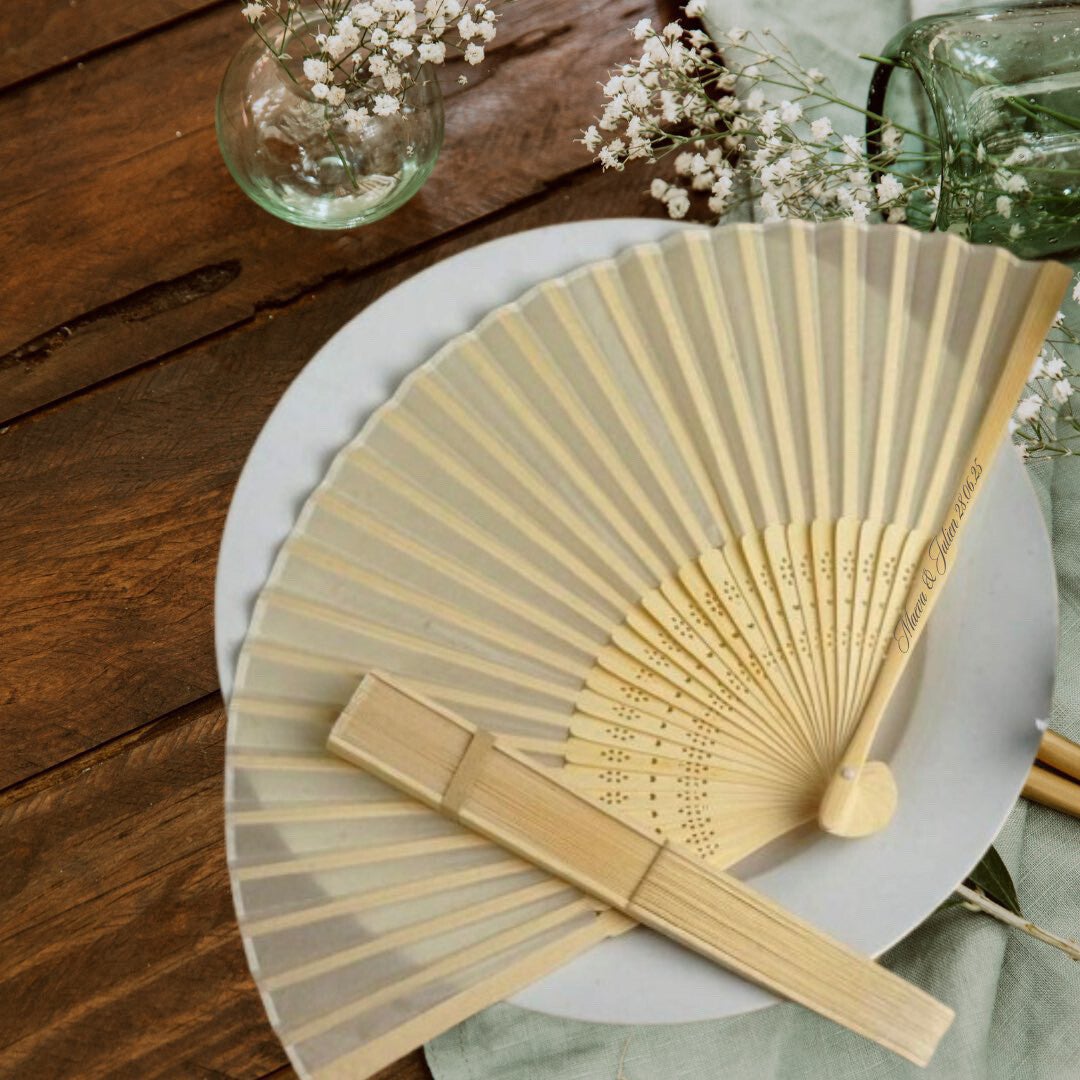 🌿 Éventail en Bois Personnalisable – Avec Étui en Organza Blanc